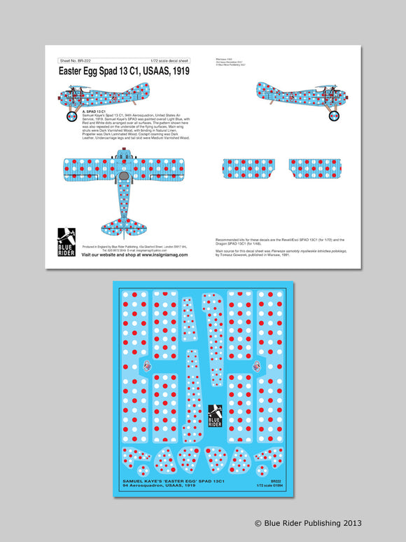BR222 Blue Rider 1/72 Spad 13C (1) 94th Aerosquadron Samuel Kaye's 'Easter Egg' SPAD. Overall light blue with red and white dots